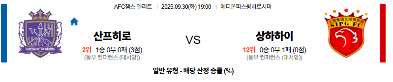 산프레체히로시마 대 상하이하이강 AFC챔피언스리그 09월 30일 맞대결 생중계, 스포츠중계, 스포츠분석