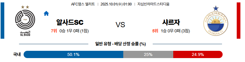 알사드 대 알샤르자 AFC챔피언스리그 10월01일 맞대결 생중계, 스포츠중계, 스포츠분석