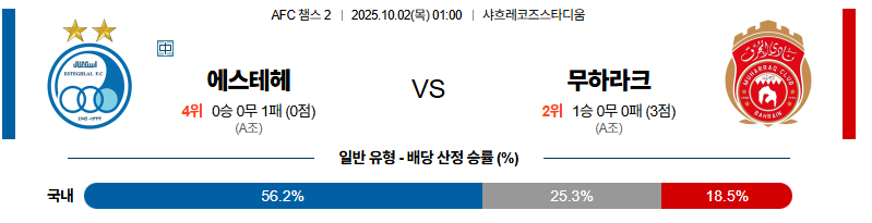 에스테그랄 대 알무하라크 AFC챔피언스리그2 10월02일 맞대결 생중계, 스포츠중계, 스포츠분석