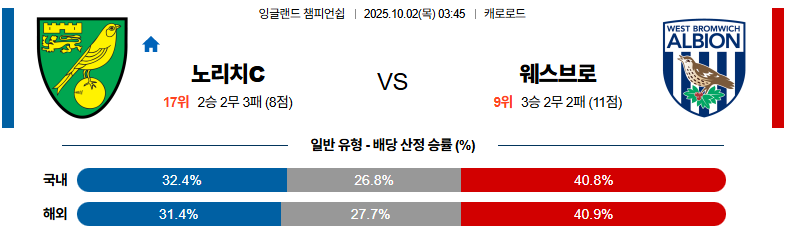 노리치시티 대 웨스트브로미치 잉글랜드챔피언쉽 10월02일 맞대결 생중계, 스포츠중계, 스포츠분석