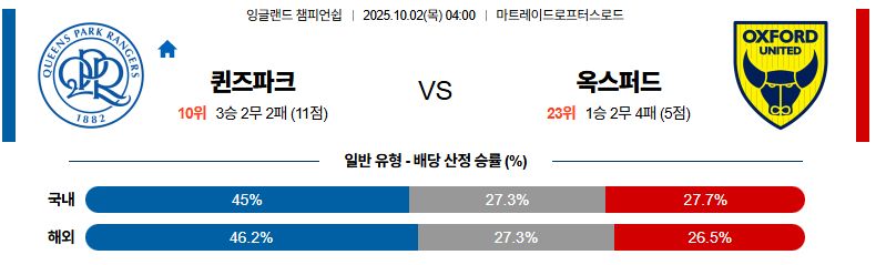 QPR이 홈에서 주도권을 잡고 경기를 유리하게 끌고 갈 가능성이 매우 높습니다. 옥스퍼드가 초반 강한 수비 블록과 롱패스로 예상치 못한 역습을 노린다면 일정 부분 변수를 만들 수 있겠지만, QPR의 공격 전개에 큰 어려움을 줄 수는 없을 것입니다.
