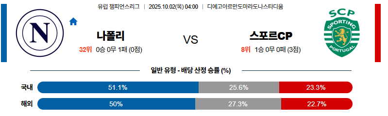 나폴리는 홈에서 압도적인 전술 완성도와 공격 패턴을 바탕으로 상대를 흔들 준비가 되어 있습니다. 스포르팅은 장거리 원정으로 인한 체력 소모와 환경 적응 실패, 그리고 원정 경기력 저하가 겹쳐 불안 요소가 큽니다. 이 경기는 나폴리가 홈 우위와 전술적 완성도를 바탕으로 초반부터 흐름을 장악하며 승리를 가져갈 가능성이 높습니다.