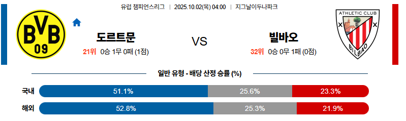 도르트문트 대 빌바오 UEFA챔피언스리그 10월02일 맞대결 생중계, 스포츠중계, 스포츠분석