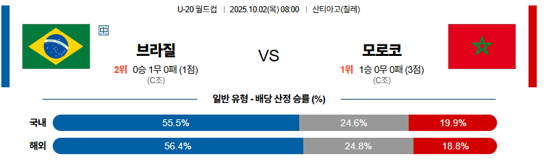 브라질 패, 핸디 패, 언더. 모로코는 스페인전에서 강팀을 흔드는 전술적 응집력과 자신감을 증명했습니다. 브라질은 개인 기량은 뛰어나지만 팀 조직력과 경기 집중력에서 약점을 드러내며 승부처에서 흔들릴 수 있습니다. 전술적 안정감과 상승세를 동시에 가진 모로코가 이번 경기의 흐름을 완전히 가져갈 가능성이 높습니다.