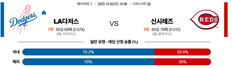 LA다저스 대 신시내티 MLB 10월02일 맞대결 생중계, 스포츠중계, 스포츠분석