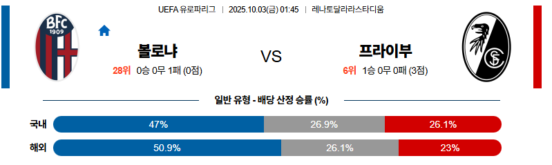 볼로냐 대 프라이부르크 UEFA유로파리그 10월03일 맞대결 생중계, 스포츠중계, 스포츠분석