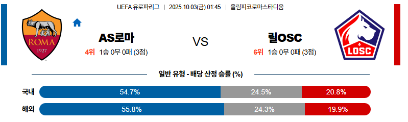 AS로마 대 릴 UEFA유로파리그 10월03일 맞대결 생중계, 스포츠중계, 스포츠분석