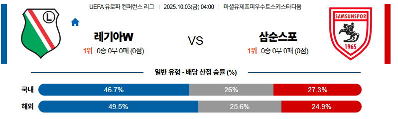 레기아바르샤바 대 삼순스포르 UEFA유로파컨퍼런스리 10월03일 맞대결 생중계, 스포츠중계, 스포츠분석