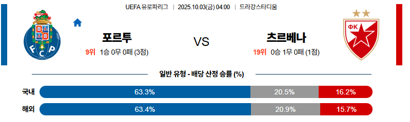 FC포르투가 전력 차이와 전술적 완성도에서 우위를 보이며, 경기 초반부터 주도권을 쥐고 찬스를 만들어낼 가능성이 높습니다. 즈베즈다가 공격 전개가 막히면 장시간 수비에 몰릴 가능성이 큽니다.