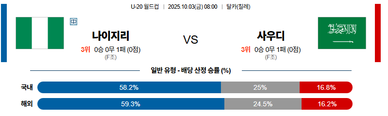 나이지리아는 전통적으로 연령별 대회에서 피지컬과 운동 능력으로 상대를 압도해왔습니다. 사우디아라비아는 기술적 플레이를 펼치지만 강한 압박과 높은 템포를 90분 내내 버티기 어려울 가능성이 높습니다. 전술, 체력, 심리 모두 나이지리아 쪽으로 기울어진 이번 경기는 홈팀 승리 기대값이 뚜렷합니다.