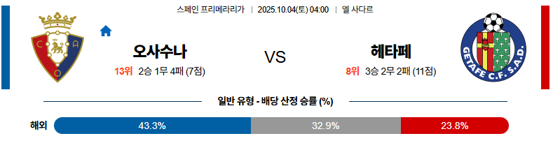 오사수나 대 헤타페 라리가 10월04일 맞대결 생중계, 스포츠중계, 스포츠분석