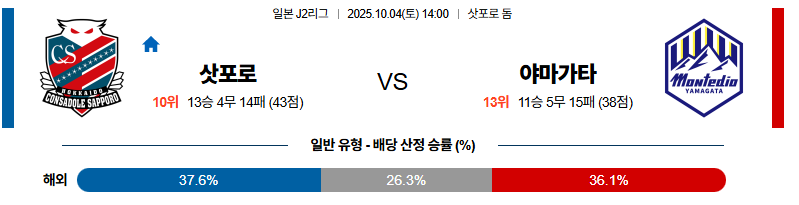 삿포로 대 야마가타 J리그2 10월04일 맞대결 생중계, 스포츠중계, 스포츠분석