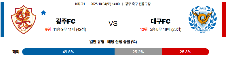 광주 대 대구 K리그1 10월04일 맞대결 생중계, 스포츠중계, 스포츠분석