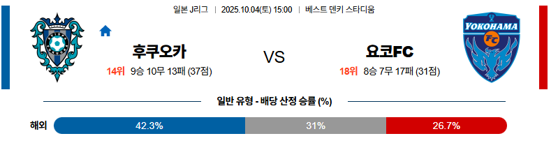 후쿠오카는 벤 칼리파의 타점 높은 포스트 플레이와 중원의 안정적 전환으로 공격 흐름을 완성하며, 교체 카드의 질적 우위로 후반에도 경기 템포를 유지할 가능성이 큽니다. 요코하마FC는 압박 해제와 후반 체력 유지에서 불안정하여 경기 후반으로 갈수록 흔들릴 위험이 높습니다. 결국 후쿠오카가 홈에서 승리를 가져갈 가능성이 유력합니다.