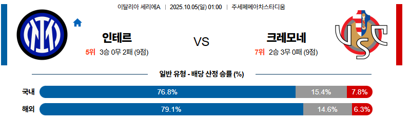 인터밀란 대 크레모네세 세리에A 10월05일 맞대결 생중계, 스포츠중계, 스포츠분석