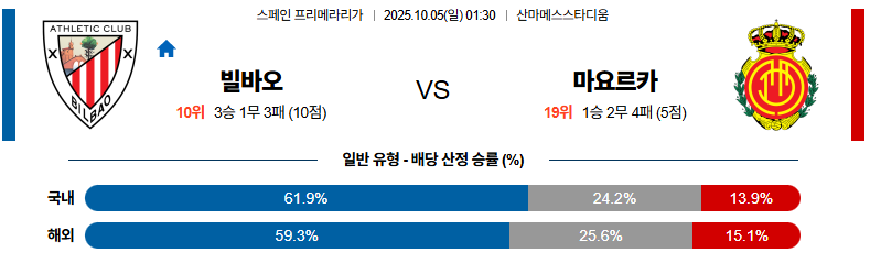 빌바오 대 마요르카 라리가 10월05일 맞대결 생중계, 스포츠중계, 스포츠분석
