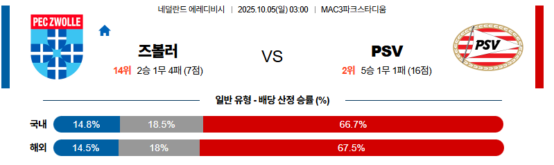 즈볼레는 포백 간격 유지와 전환 수비에서 큰 약점을 노출하고 있으며, 강한 압박과 빠른 연계를 견디기 어렵습니다. 아인트호벤은 루번 반 봄멜을 축으로 한 공격 전개와 페리시치, 스하우턴의 결정력이 더해져 경기 주도권을 확실히 잡을 가능성이 높습니다. 결국 전력 차이와 전술 완성도의 격차가 승부를 가를 것이며, 아인트호벤이 우세를 점하며 승리를 가져갈 가능성이 매우 큽니다.