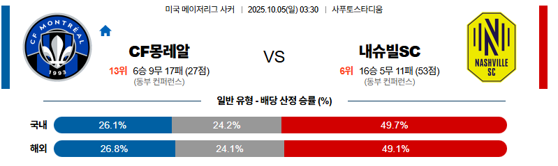 몬트리올 대 내슈빌 메이저리그사커 10월05일 맞대결 생중계, 스포츠중계, 스포츠분석