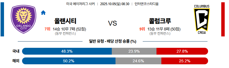 올랜도시티는 견고한 수비와 빠른 역습으로 콜럼버스의 점유형 빌드업을 끊어낼 수 있습니다. 콜럼버스는 실리 축구에 약한 전적이 반복되고 있으며, 전개가 막힐 때 공격이 단조로워지는 패턴을 보이고 있습니다. 결국 홈의 안정감과 후방 전환 속도를 앞세운 올랜도시티가 경기 흐름을 주도하며 승리를 가져갈 가능성이 높습니다.
