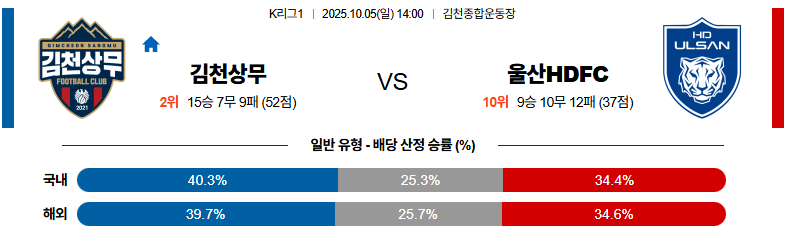 김천은 탄탄한 포백과 정교한 전환 플레이를 기반으로 울산의 전술적 혼란을 공략할 수 있습니다. 울산은 실험적 전술 실패와 체력 소모로 후반 집중력 저하가 이어지고 있어 홈에서 김천이 경기를 지배할 가능성이 높습니다. 이번 경기는 김천이 전술적 완성도와 안정된 조직력으로 확실한 승리를 노릴 수 있는 매치업입니다.