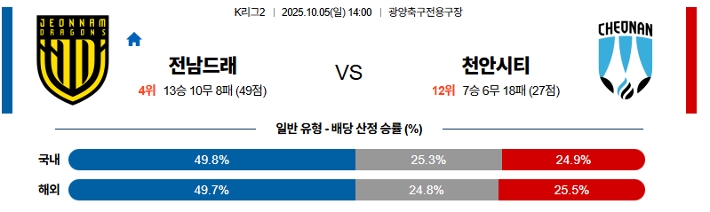 전남 대 천안 K리그2 10월05일 맞대결 생중계, 스포츠중계, 스포츠분석