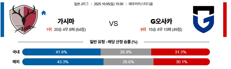 가시마 앤틀러스는 안정적인 수비 블록과 초고속 역습을 완벽히 결합해 홈에서 치명적인 위협을 만들어낼 수 있습니다. 감바 오사카는 포백 간격 유지와 전환 속도에서 계속 약점을 드러내고 있으며, 중원 세컨드 볼 경합에서도 밀리고 있습니다. 전술적 상성과 홈 템포를 고려할 때, 이번 경기는 가시마가 주도권을 잡고 승리로 연결될 가능성이 매우 높습니다.