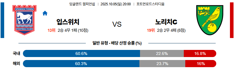 입스위치 대 노리치시티 잉글랜드챔피언쉽 10월05일 맞대결 생중계, 스포츠중계, 스포츠분석