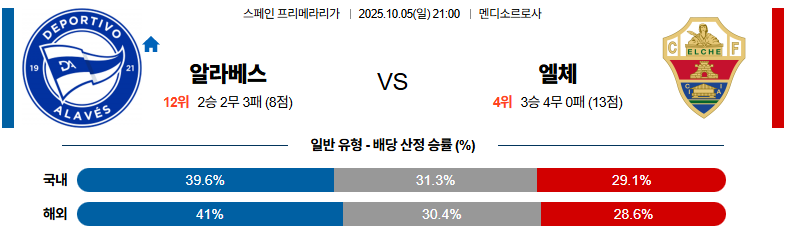 이번 경기는 안정적인 두 줄 수비와 빠른 전환을 앞세운 홈팀 알라베스와, 템포 변화를 무기로 삼은 원정팀 엘체의 대결입니다. 알라베스는 마르티네스의 포스트 플레이와 구리디·블랑코의 연계로 기회를 만들 수 있지만, 강한 압박과 빠른 템포 전환에 라인이 쉽게 벌어지는 약점이 노출될 가능성이 있습니다. 반면 엘체는 라파 미르의 피지컬 버티기와 멘도자의 정교한 전진 패스로 전방을 활발히 공략하며, 발레라가 측면 폭을 넓혀 박스 침투 경로를 다양하게 만듭니다. 따라서 알라베스가 블록을 유지해도 빠른 전환과 2선의 세컨드 런이 박스 안을 흔들 수 있고, 후반 교체 카드 싸움에서도 엘체가 우위를 점할 것으로 보입니다. 또한 시즌 초반 돌풍으로 리그 4위에 올라 있는 상승세는 심리적 자신감을 더해줄 것입니다. 결국 템포 변화와 전환 속도, 교체 자원 활용을 종합적으로 고려할 때 원정팀 엘체가 승리를 가져갈 가능성이 높습니다.