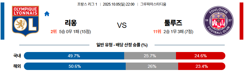 리옹은 테스만의 킥 능력을 중심으로 세트피스 한 방과 중원 장악력을 무기로 경기를 지배할 수 있습니다. 툴루즈는 3백 전환 속도와 빌드업 안정성이 떨어져 경기 후반으로 갈수록 불안정해질 가능성이 큽니다. 결국 세트피스와 전술적 우위에서 앞선 리옹이 홈에서 흐름을 주도하며 승리를 가져갈 가능성이 높습니다.