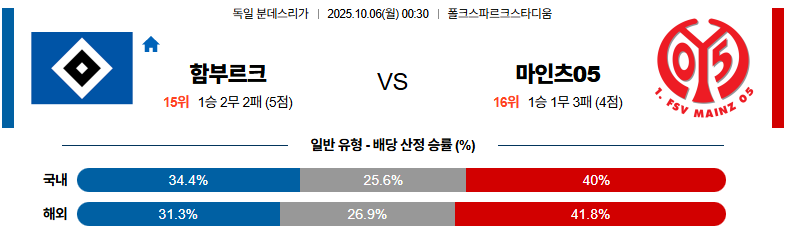 함부르크 대 마인츠 분데스리가 10월06일 맞대결 생중계, 스포츠중계, 스포츠분석