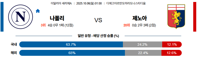 나폴리는 측면과 하프스페이스를 동시에 활용하는 정밀한 패턴 플레이로 상대의 수비 라인을 흔들 준비가 되어 있습니다. 제노아의 느린 전환과 불안정한 라인 유지가 반복된다면 홈팀 나폴리가 경기의 흐름을 완전히 장악할 것입니다. 전술적 상성과 전력 차이를 고려할 때, 이번 경기는 나폴리의 승리 가능성이 매우 높습니다.