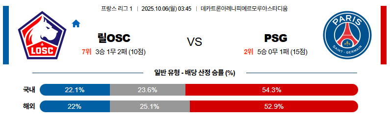 릴 대 파리생제르망 리그앙 10월06일 맞대결 생중계, 스포츠중계, 스포츠분석