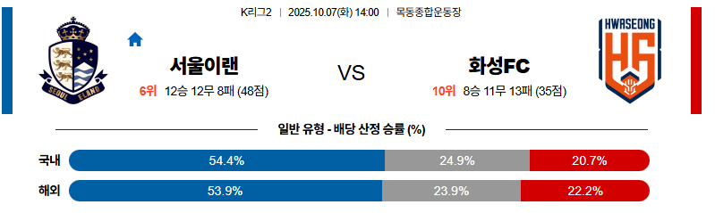 서울이랜드가 전술적 우위를 바탕으로 경기를 주도할 가능성이 높습니다. 화성은 두 줄 수비와 빠른 전환을 활용하겠지만, 중원 수적 열세와 체력적 부담이 겹칠 경우 후반에는 완전히 밀릴 위험이 있습니다.