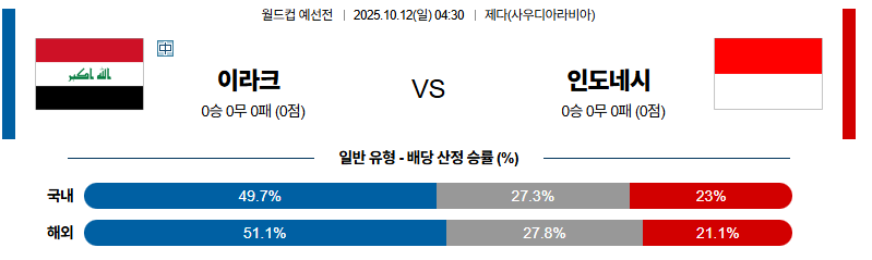 이라크가 경기 내내 높은 점유율과 세트피스 파괴력으로 압도할 가능성이 큽니다. 특히 후세인-바예시 조합이 만들어내는 제공권 압박과 세트피스 위협을 인도네시아가 90분 내내 버텨낼 가능성은 낮습니다.