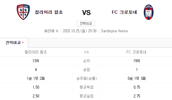 칼리아리 크로토네 10월25일 세리에A 축구분석 스포츠중계 무료분석