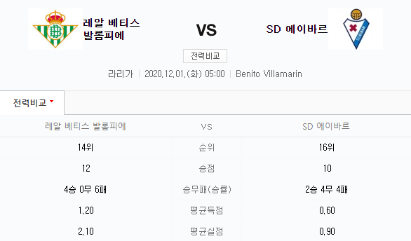 베티스 에이바르 분석 12월1일 라리가 축구분석 스포츠중계 무료분석
