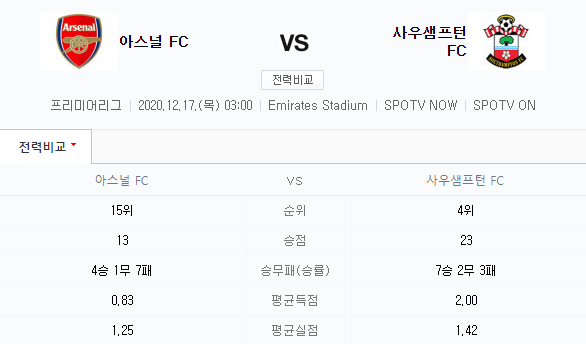 아스날 사우샘프턴 12월17일 프리미어리그 축구분석 스포츠중계 무료분석