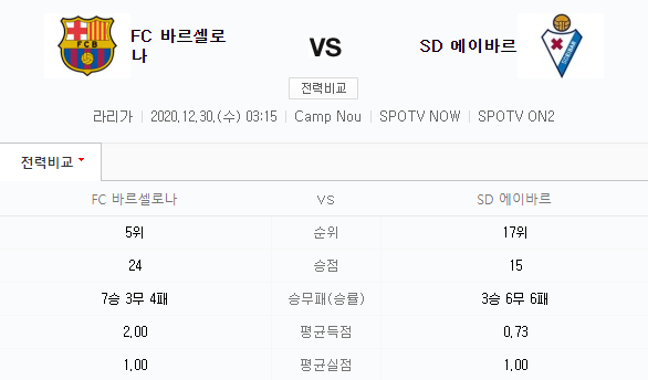 바르셀로나 에이바르 12월30일 라리가 축구분석 스포츠중계 무료분석