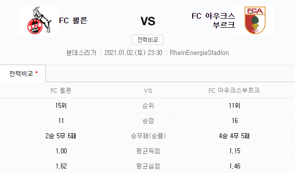 쾰른 아우크스부르크 1월2일 분데스리가 축구분석 스포츠중계 무료분석