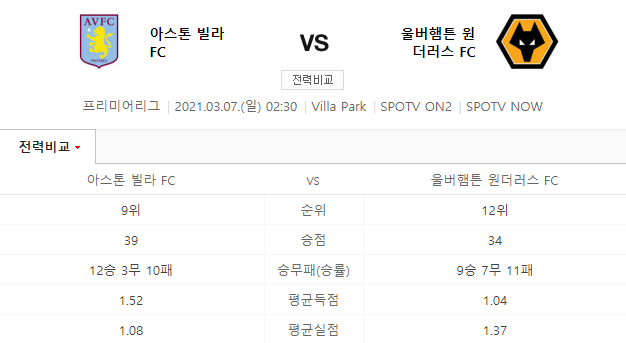 아스톤빌라 울버햄튼 3월7일 프리미어리그 축구분석 스포츠중계 무료분석