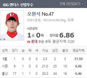 이어가고 있다. 이번 경기에서 오원석이 선발 등판할 예정이며 현재까지 1승 21이닝 25삼진