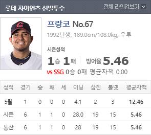 있다. 이번 경기에서 프랑코가 선발 등판할 예정이며 1승 1패 28이닝 19삼진 평균자책 5.46을