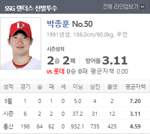 있다. 이번 경기에서 박종훈이 선발 등판할 예정이며 2승 2패 37이닝 31삼진 평균자책 3.11로