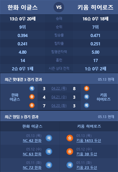 키움 한화 분석 5월 14일