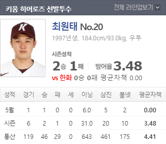 직전 경기에서 승리하며 연승을 기록한 키움은 이번경기 선발로 최원태 선수가 등판한