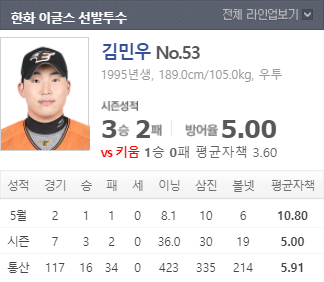 부진을 탈출하지 못하고 있다. 이번경기 선발로 나서는 김민우 선수가 이번시즌 7경기