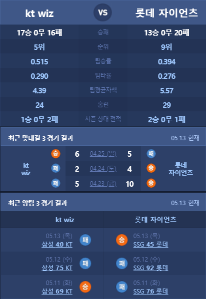 롯데 KT 분석 5월 14일