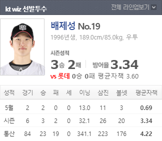 직전 경기에서 패배로 연패를 기록한 KT는 이번경기 선발로 배제성 선수가 등판한다.
