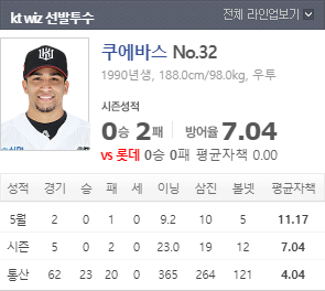 분위기를 보이고 있다. 이번 경기에서 쿠에바스가 선발 등판할 예정이며 올 시즌 2패 23이닝 19삼진