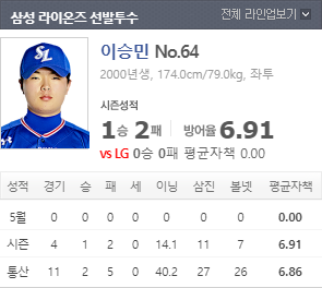 부진을 보이고 있다. 이번 경기에서 이승민이 선발 등판할 예정이며 올 시즌 1승 2패 14이닝 11삼진